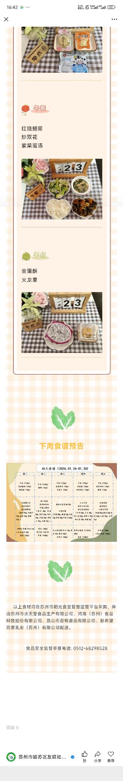友联幼儿园2025年度第一学期(1.26-1.30)幼儿食谱